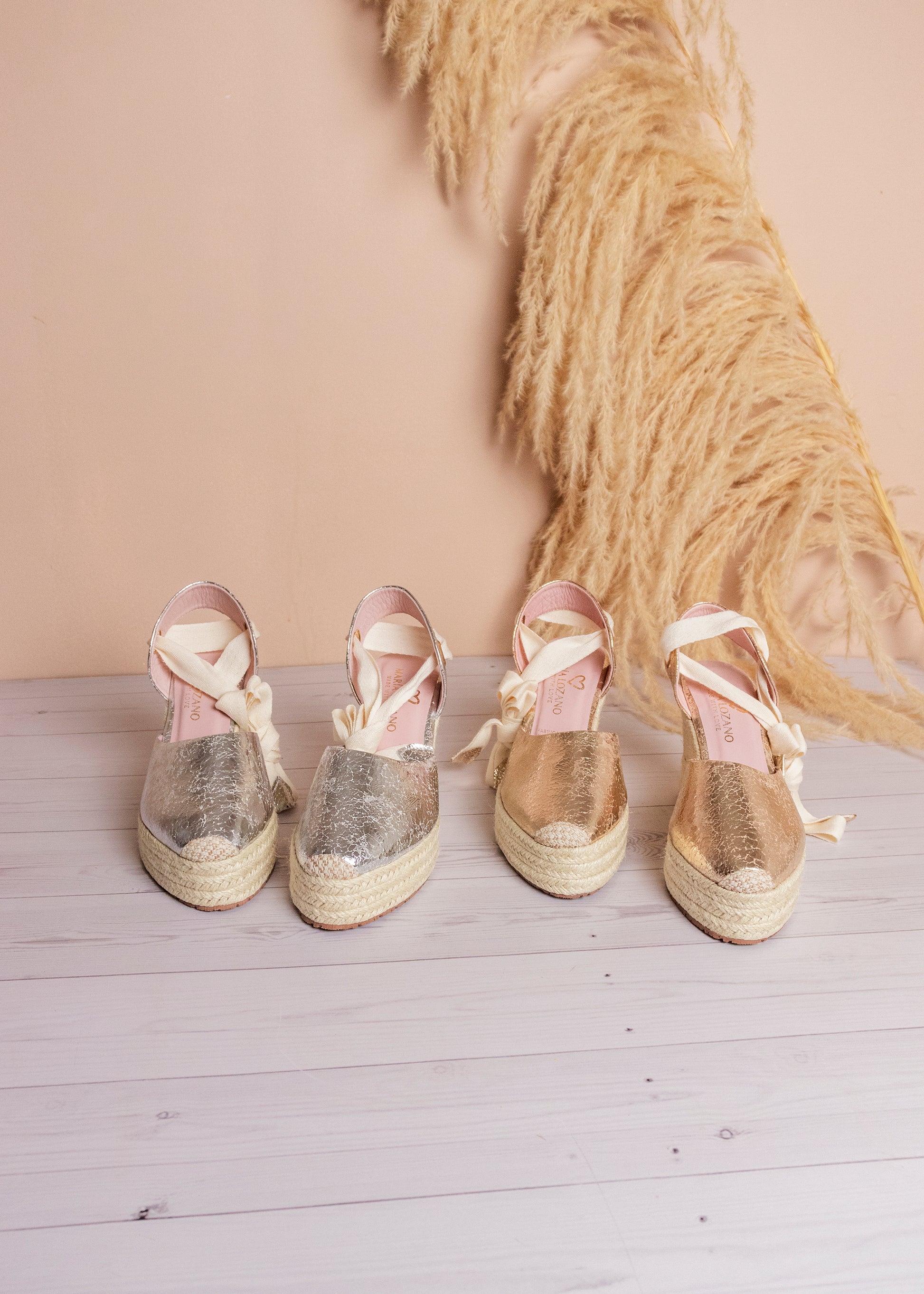 ¡Brilla con elegancia con nuestras Espadriles de cuero ! Disponibles en deslumbrantes tonos plata y oro, combinan la suavidad del cuero con la frescura del yute trenzado, mientras las cintas de raso añaden un toque romántico y cómodo. Cómodas, estilosas y perfectas para cualquier ocasión, ¡haz que cada paso sea inolvidable con estas joyas para tus pies!