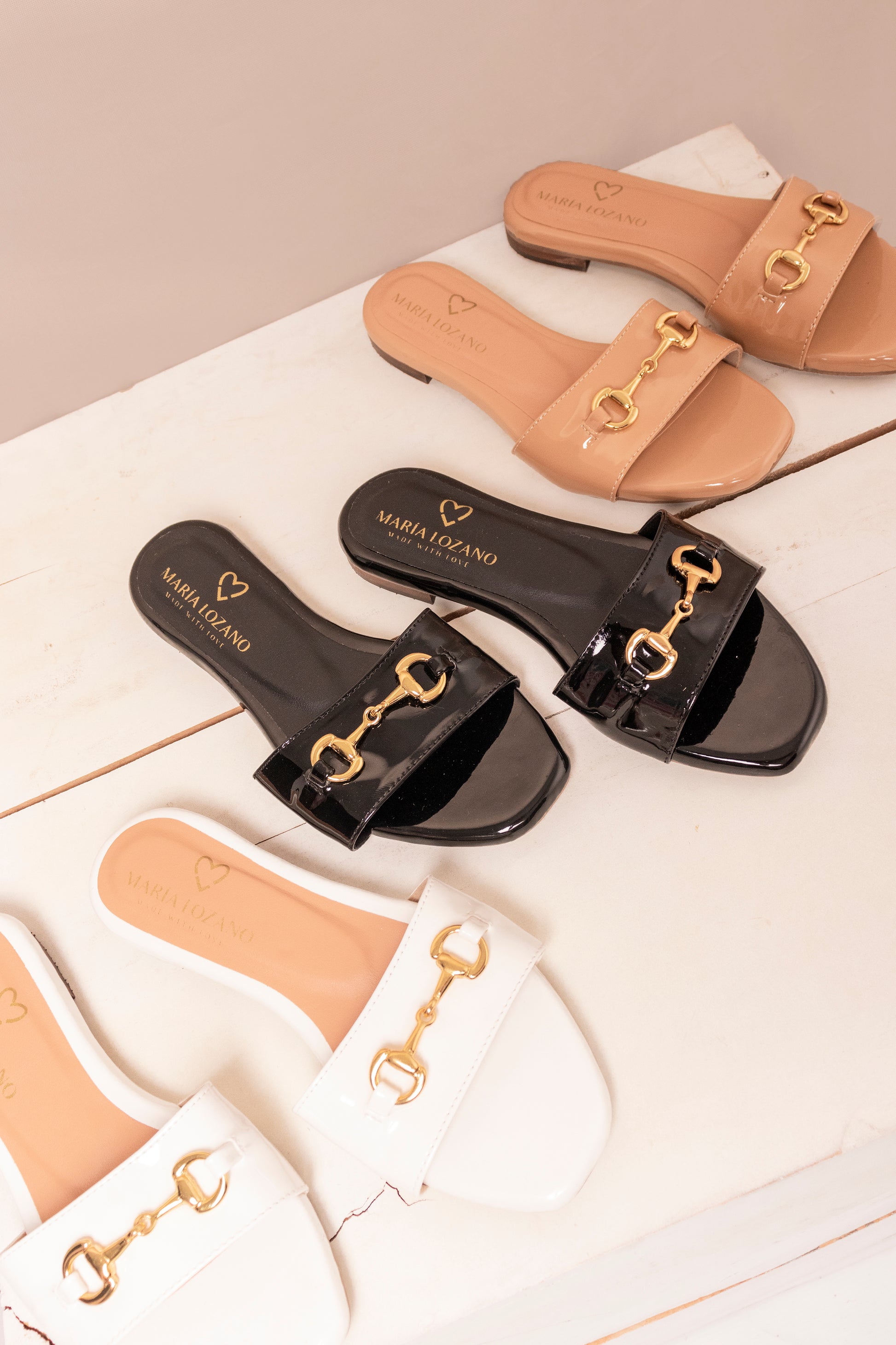 Estas sandalias planas con herraje dorado son ese toque sofisticado que transforma cualquier look en segundos. Disponibles en colores atemporales que combinan con todo, son tan versátiles como tu estilo de vida.