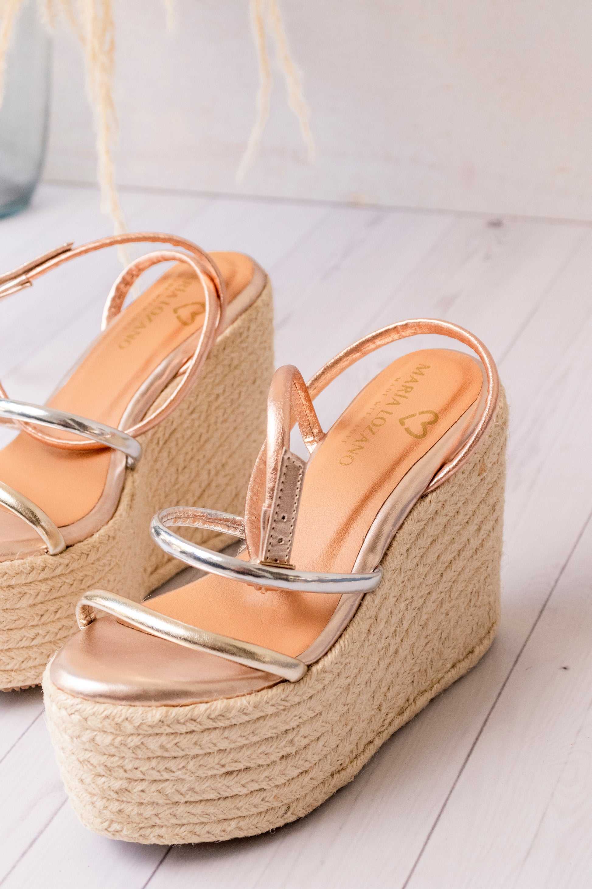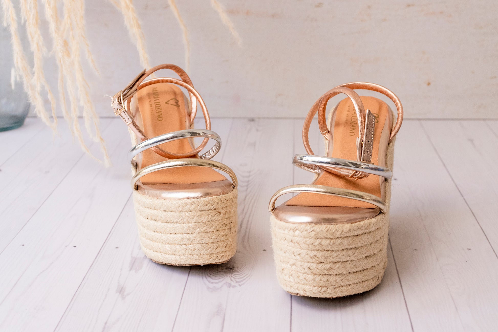¡Deslumbra con nuestras plataformas tricolor en oro, rosa y plateado! Este diseño audaz combina la suavidad del cuero con la frescura del yute trenzado, creando un look moderno y sofisticado. Con su tacón alto y correas entrelazadas, estas plataformas ofrecen comodidad y estilo para destacar en cualquier ocasión. ¡Elige el brillo que te define y camina con confianza!
