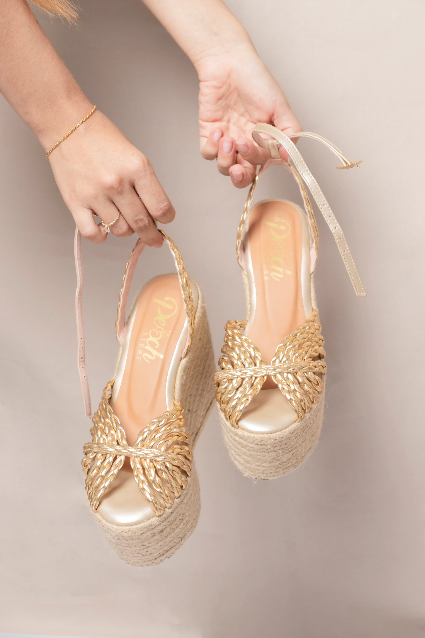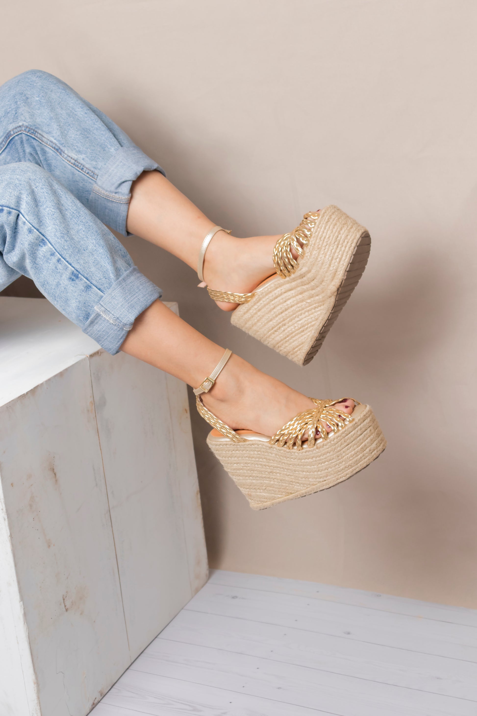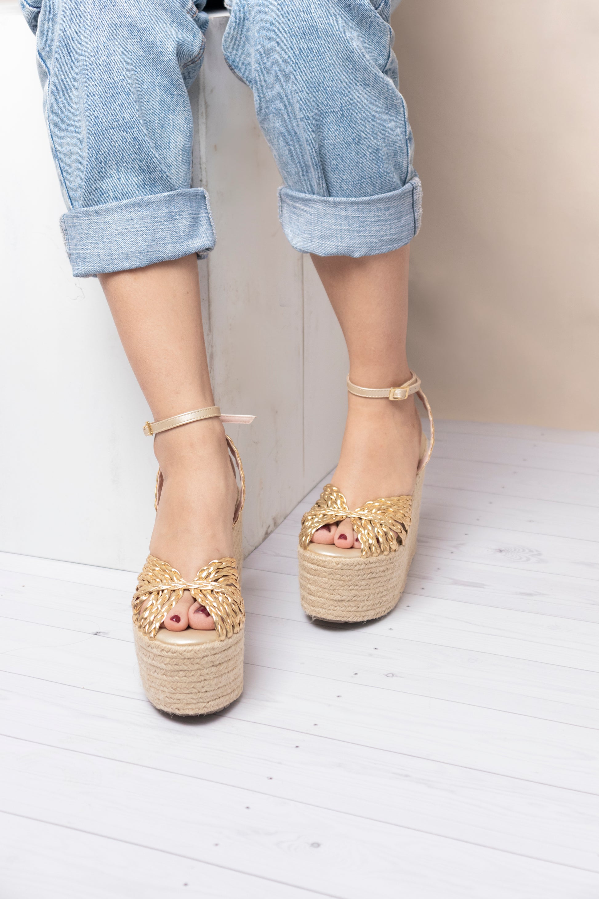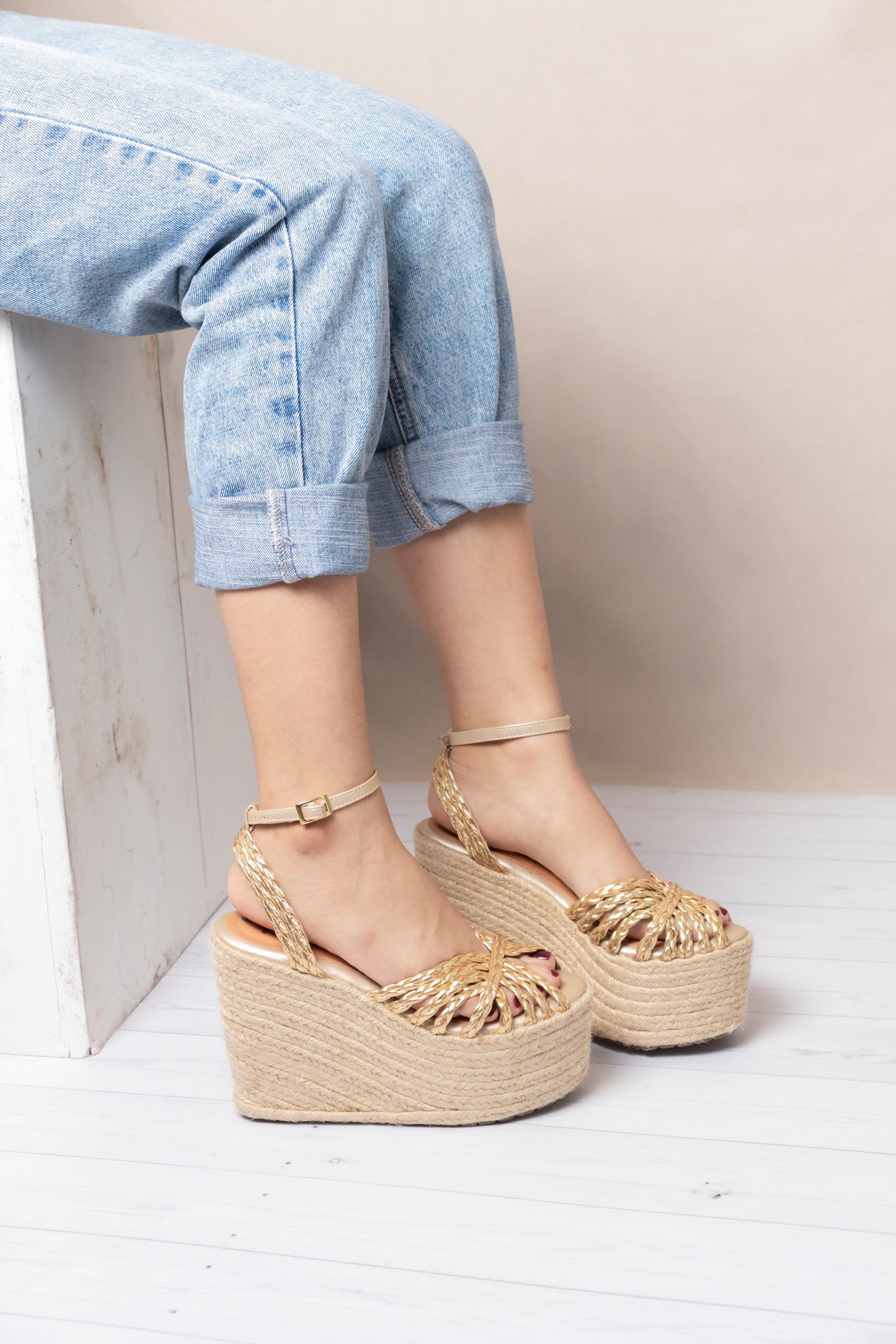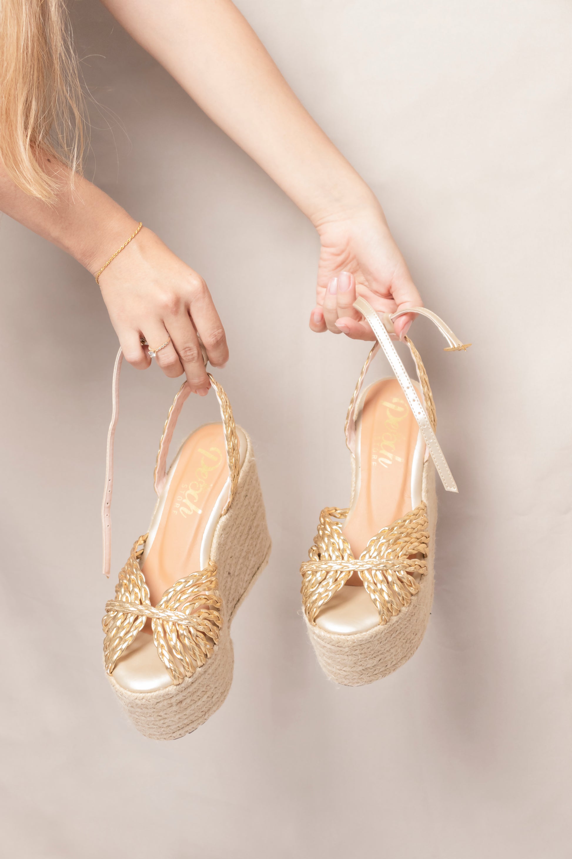 ¡Eleva tu estilo con las plataformas Juliana! Estas sandalias destilan elegancia con su diseño trenzado en dorado metálico, realzado por la frescura del yute natural y cintas delicadas que abrazan tus tobillos. Perfectas para un look cómodo y cómodo, las Juliana te harán brillar en cada ocasión. ¡Atrévete a destacar con estas bellezas únicas!