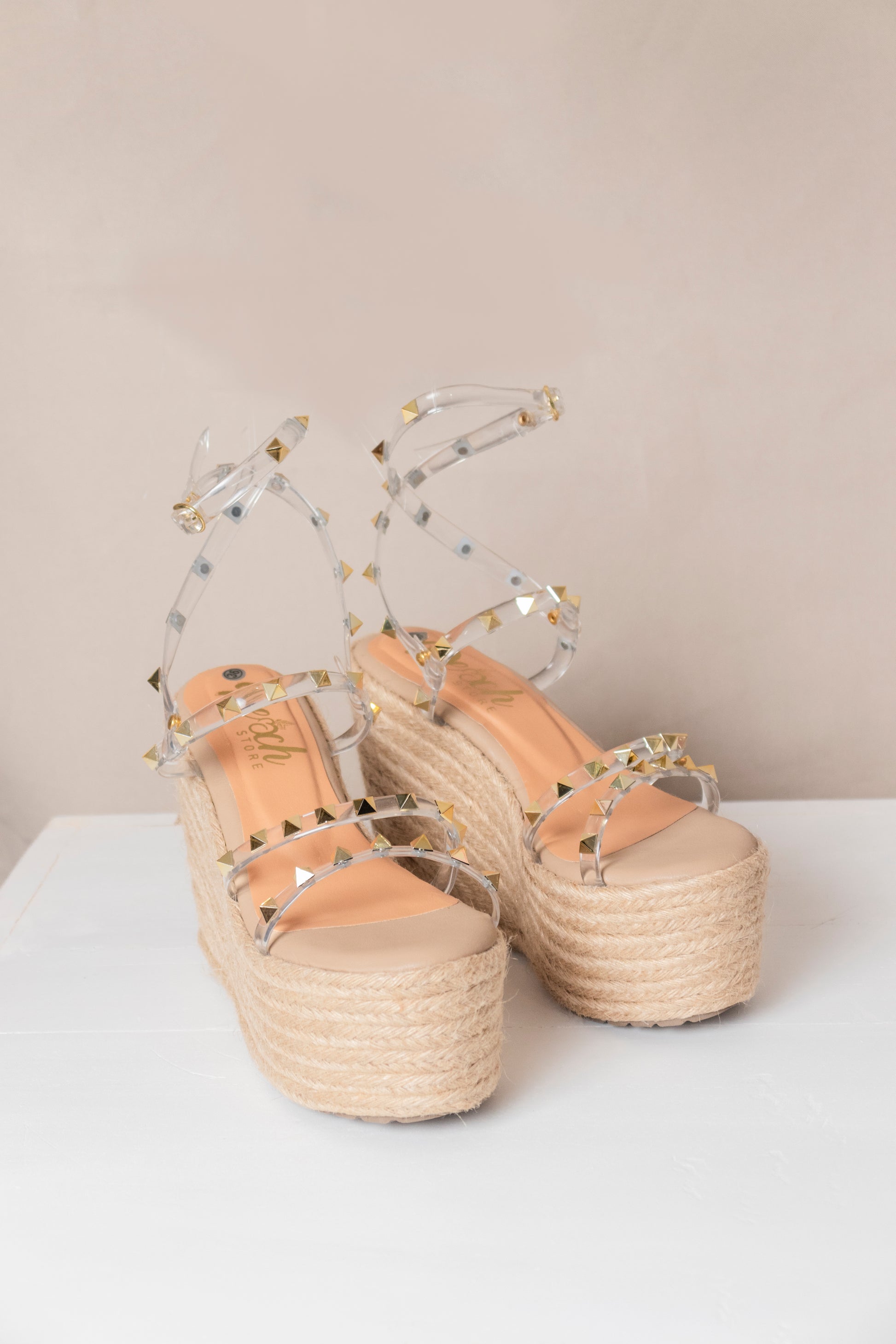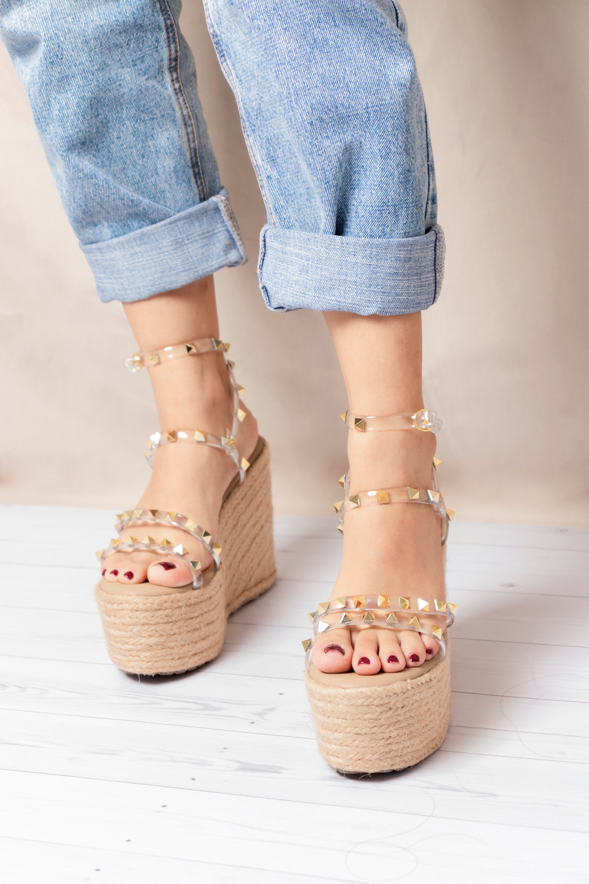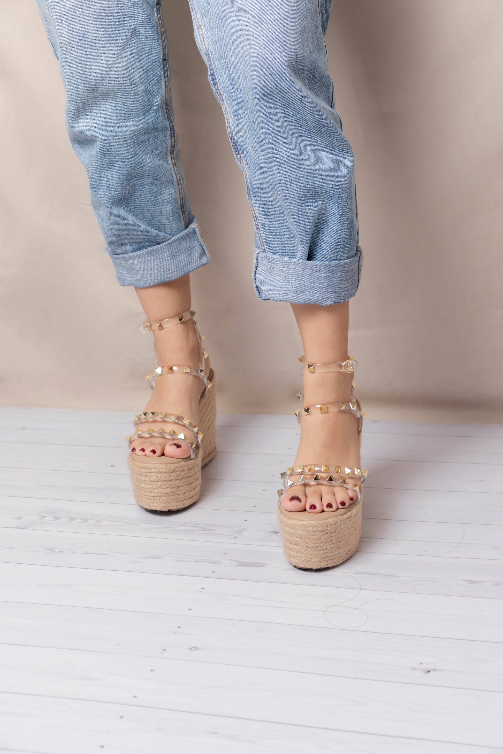 ¡Domina cada paso con las plataformas Karina! Estas sandalias de tacón alto combinan la frescura del yute trenzado con correas transparentes adornadas con brillantes remaches dorados, aportando un toque audaz y moderno. Cómodas, ligeras y llenas de estilo, son el complemento perfecto para destacar con confianza en cualquier evento. ¡Hazlas tuyas y brilla sin igual!
